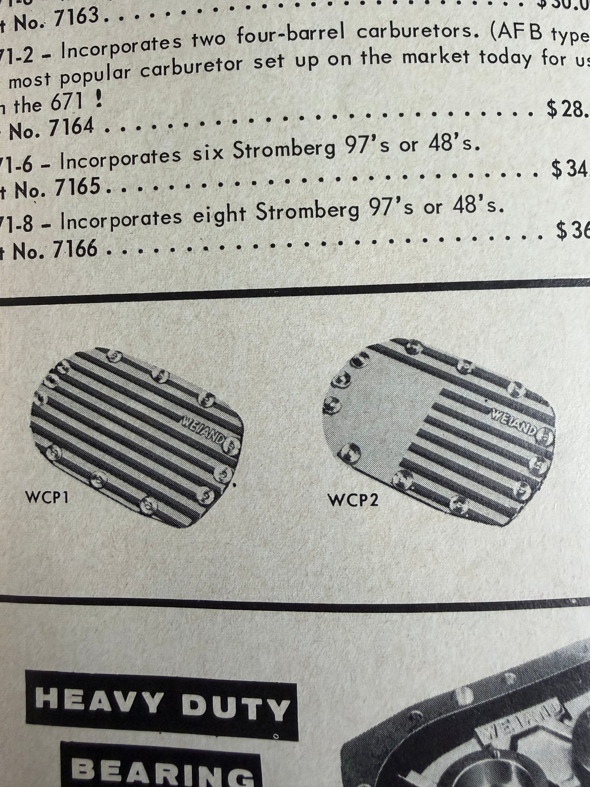 I have only 1 of these to offer. WEIAND 671 supercharger rear cover. Fits the old style 371 471 671 blowers with the smooth end plates. Cast in 356 aluminum, polished fins and drilled with precision. Same as the weiand cover created in 1960. Thanks